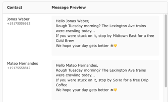 Before you send a message or campaign, Telerivet shows you a preview for each contact so you can confirm: